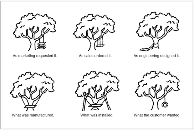 Why do companies so often fail to give customers what they want? The problem is depicted well in the cartoon shown below.The company pursues a series of unwieldy, unworkable ideas while overlooking the customer’s desire for a simple, effective product. The problem could have been avoided, the cartoon suggests, had the company just listened to the customer.